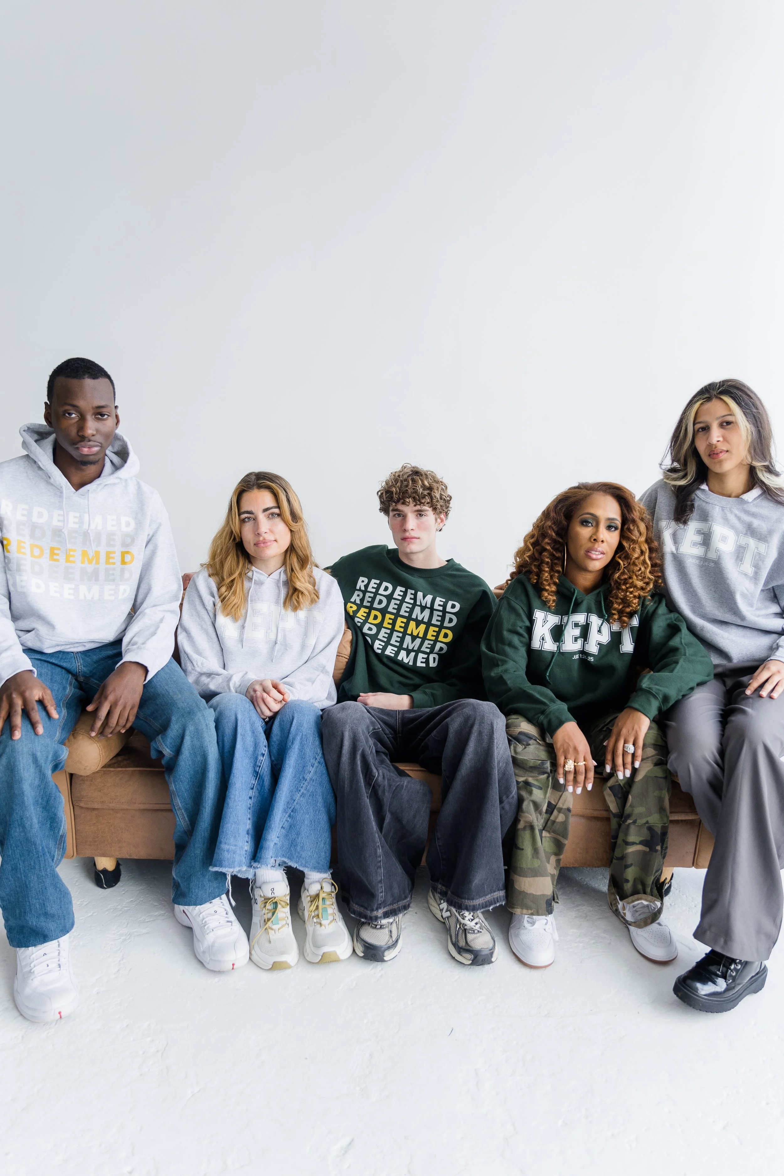 Products Kept Hooded Sweatshirt Sustained Hooded Sweatshirt Redeemed Hooded Sweatshirt Kept Crewneck Sustained Crewneck Kept- Jude Hat Kept Long Sleeve Shirt Redeemed Crewneck Kept From Falling Hat Faith Worn Boldy, Hope Worn Daily.
